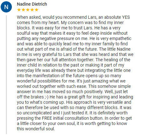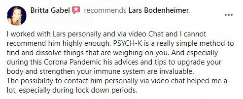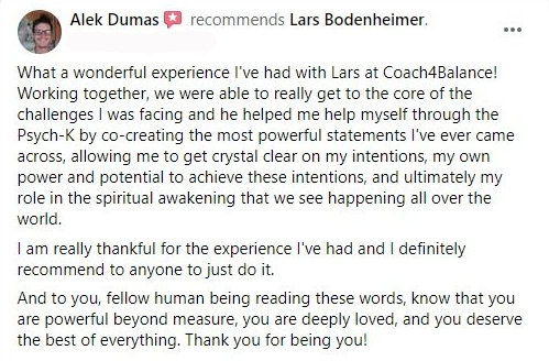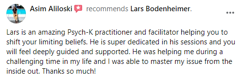 “I got to experience Lars' PSYCH-K method beginning of this year. It was amazing to find out which belief statements have been accompanying me already my entire life and are controlling my subconscious. We jointly identified and balanced a goal statement, which I am now also implementing as an affirmation in my daily morning routine as I am tapping my Thymus gland area. I am convinced that it helped me to develop a higher sense of self-acceptance.”