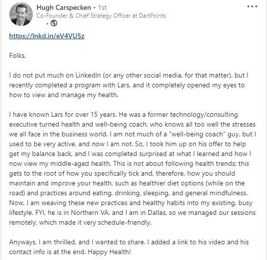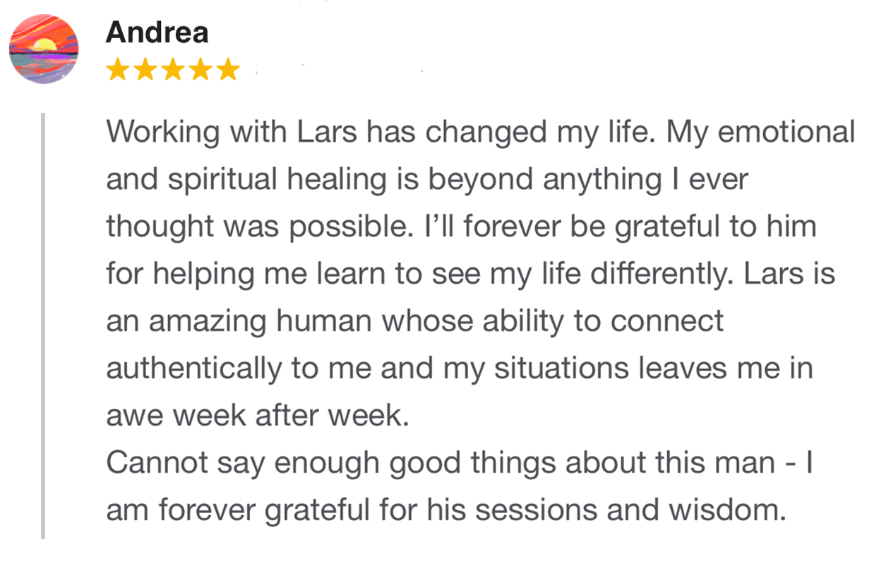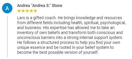 “I have been fortunate to work with Lars over the past year. His commitment to his work and health transformation shines through in every interaction. He made me feel relaxed and helped me to see not only what I was capable of but the possibilities that are available. With the help of Lars’s compassion, focus, clear methodology and earnest desire to help I have achieved goals in my life I didn’t know I could. Thank you Lars!.”