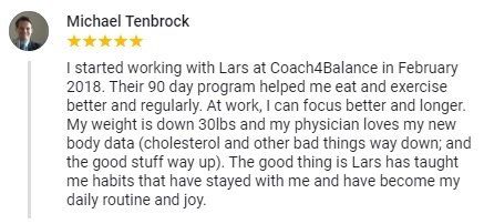 “When I started my 12-week program with Lars I was already six month into a weight loss program. I had lost about 15 pounds already but I struggled with managing sugar cravings. I believed that I would not be able to first reach my weight loss goal and second be able to keep the weight off long-term, If I did not learn to manage these sugar cravings. The program addressed not just one but several aspects of my health. While we worked on addressing the sugar cravings we also covered mental health/strength as well as movement/activities that support not only the management of the sugar cravings but opened the door to several other improvements that all complement each other and are the basis for long-term success. Besides managing my sugar cravings, I was able to improve my overall eating and hydration habits in a very powerful and healthy way. Through the reduction of sugar intake plus eating healthier and the general weight loss I have realized that several aches that were caused by some minor inflammations have gone, e.g. in my knees. I feel great and are looking forward to losing a few more pounds.”