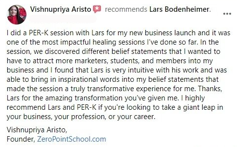 “After trying all kinds of corporate training and ways of personal self-improvement, PSYCH-K has made the difference for me. Lars is an expert in PSYCH-K lifting me to higher and happier levels in my personal life and career. Fortunately, this is a long-lasting change making me stronger and resilient to whatever life has been throwing at me since our sessions.”