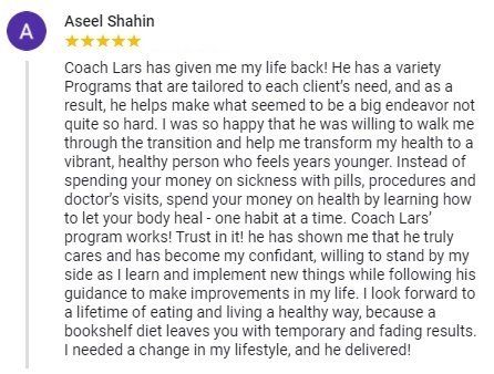 “I have been fortunate to work with Lars over the past year. His commitment to his work and health transformation shines through in every interaction. He made me feel relaxed and helped me to see not only what I was capable of but the possibilities that are available. With the help of Lars’s compassion, focus, clear methodology and earnest desire to help I have achieved goals in my life I didn’t know I could. Thank you Lars!.”